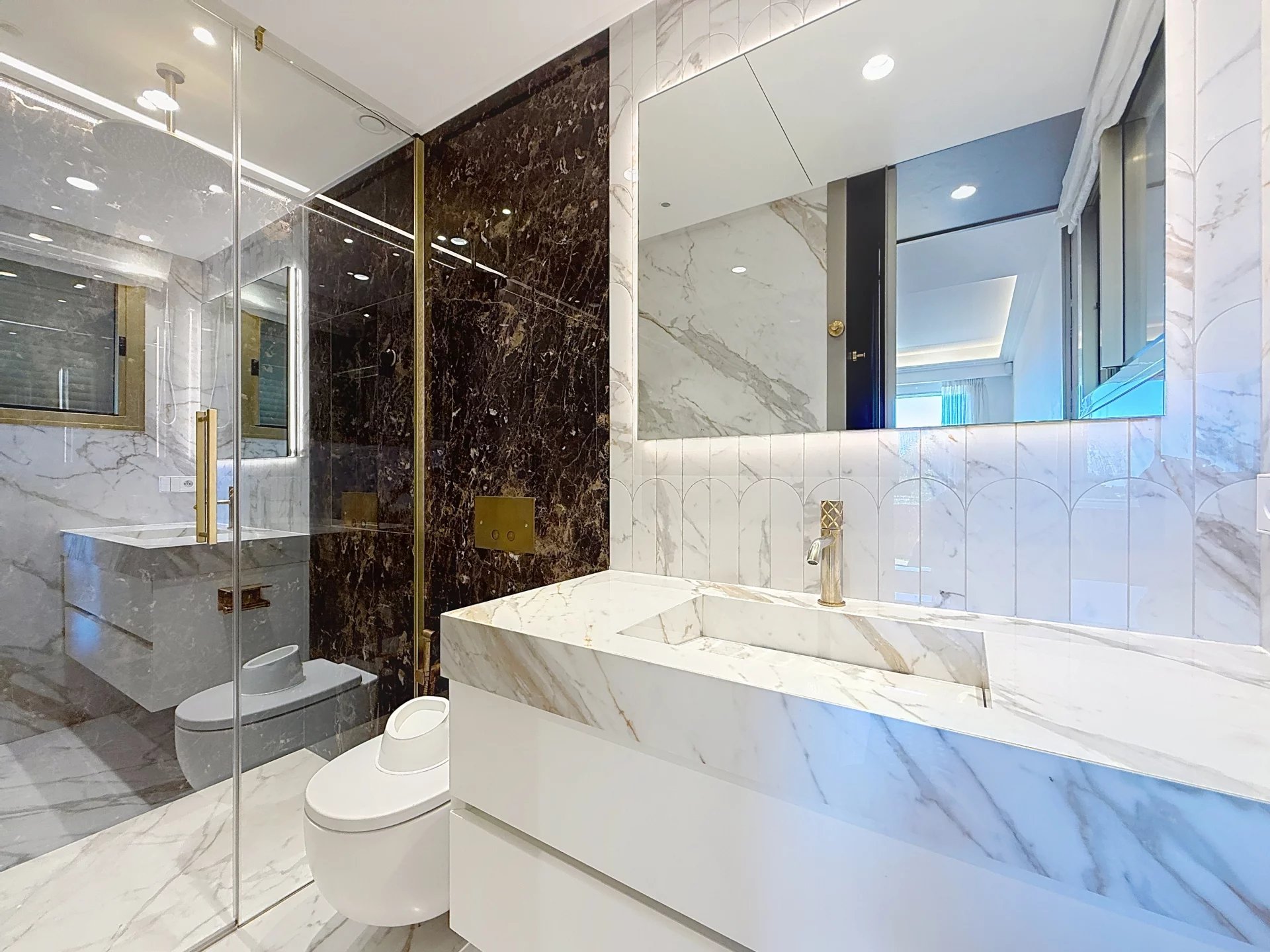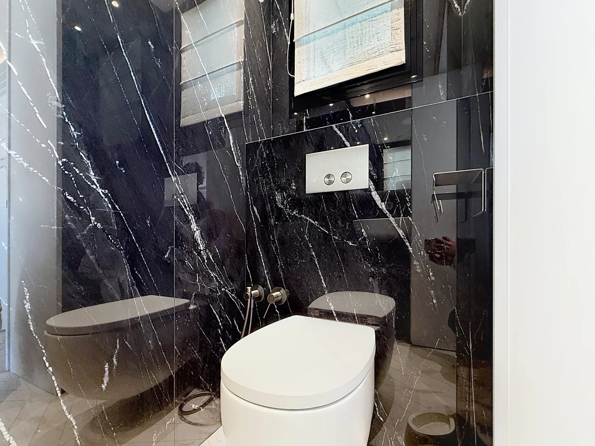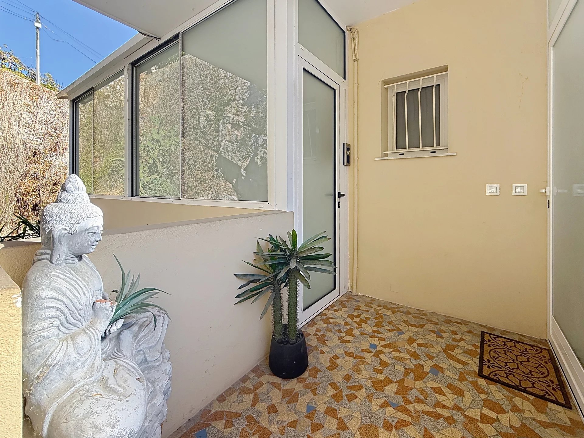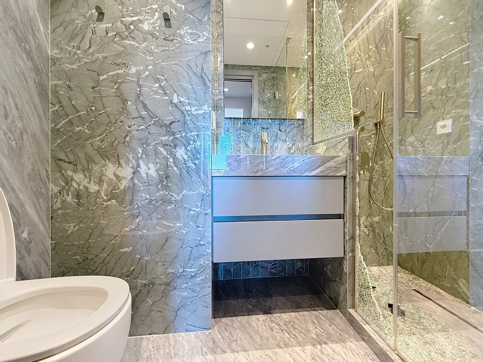 The apartment, completely renovated by an interior designer, features a spacious, bright 37m² living room on the main floor, a fully equipped open-plan kitchen opening onto a terrace with breathtaking views of the sea and the cape, a separate toilet, and access to the lower floor via designer wooden stairs, where the sleeping area features two en-suite bedrooms with custom-made wardrobes, each with its own shower and toilet, opening onto a second terrace with sea views.